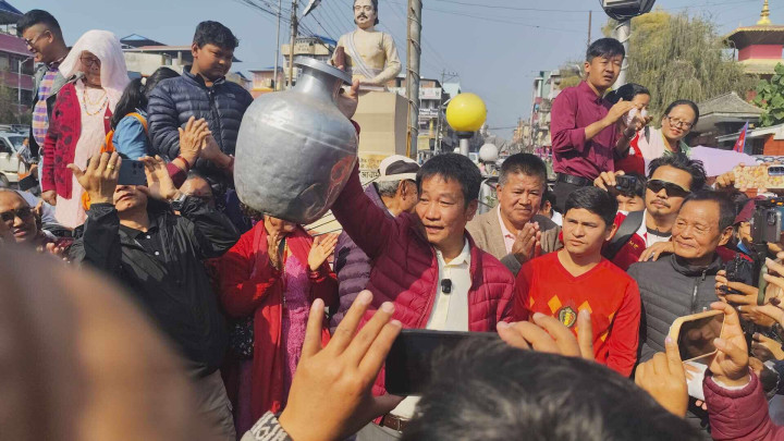 मेयर साम्पाङ भानुचोकमा थोत्रे गाग्री बोकेर आन्दोलनमा उत्रिए